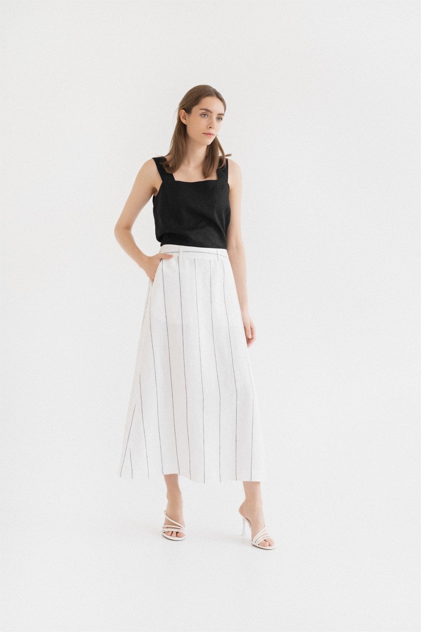 The Jasmine skirt radiates super elegance and exclusivity with its silhouette that beautifully elongates the figure. This skirt is destined to become an essential part of your wardrobe. Pair it with different footwear, shirts, or tops to effortlessly create fresh, sophisticated looks, perfect for both a casual office day and a special date night.